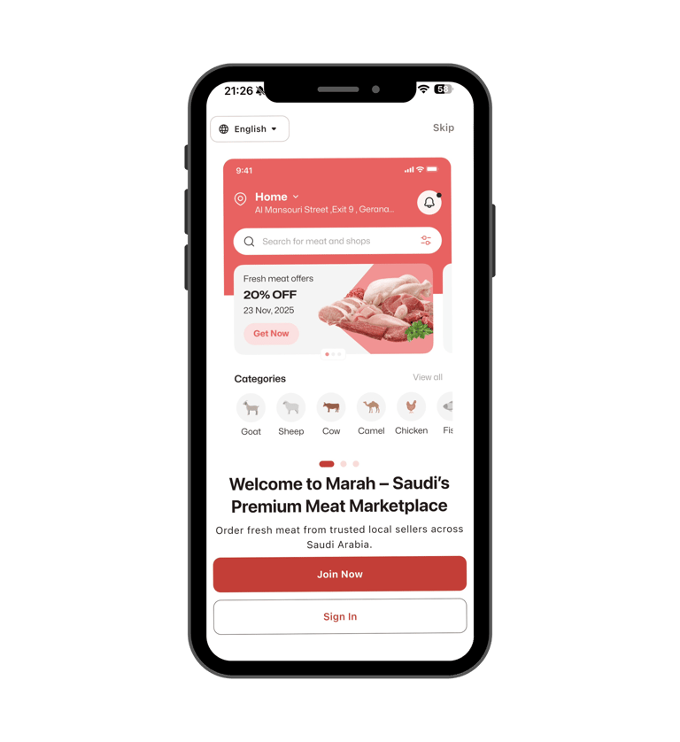 Marah connects customers with trusted meat sellers across Saudi Arabia. Order easily, while sellers manage everything in the Seller App—with wholesale (B2B) to help them grow.